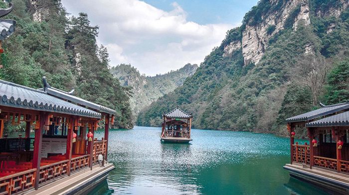 Ngồi thuyền dạo hồ Bảo Phong ngắm cảnh thiên nhiên hùng vĩ, nghe những bài dân ca của những dân tộc Thổ Gia sống dọc theo hai bờ sông biểu diển trên những chòi gỗ.